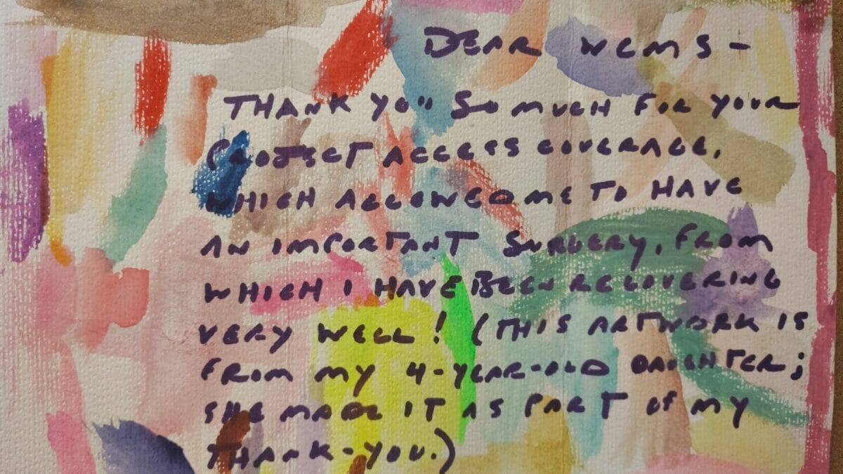 The true measure of this program is best expressed by the patients themselves. We were so touched to receive recently a watercolor testimonial (see below) that perfectly captures why this work is so vital!